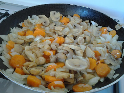 - Cuando la cebolla empieza a estar transparente, añadimos el apio que habremos limpiado bien, quitándole los "hilitos" y cortado fino. Añadimos también los champiñones bien limpios y cortados en 4.
